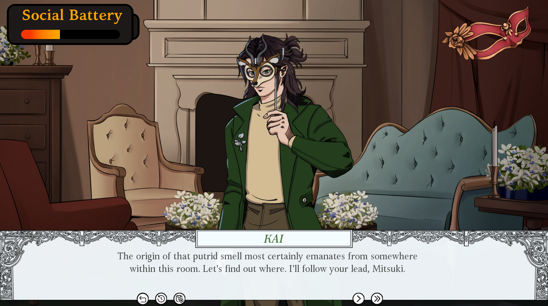 Wrote scenes involving one of the three suitors, following the larger structure of the narrative. The player’s relationship with each suitor can vary between three states throughout the game, including one specialized state that is randomized at the start of the game.