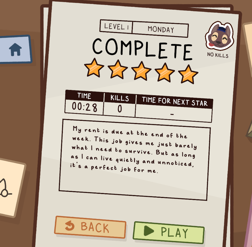 When selecting a night in ‘The WereCleaner’, you are taken to a menu that shows you many bits of info about the level including how fast you completed it, how many people you killed, and the ranking you got on the level.